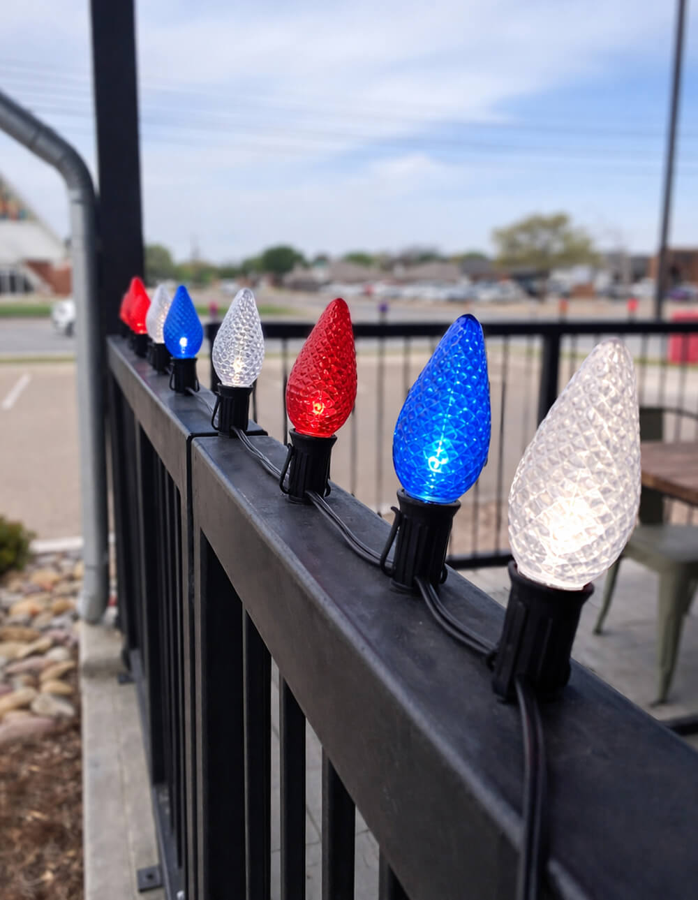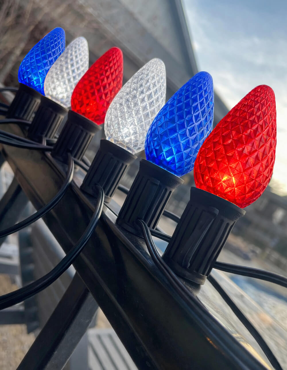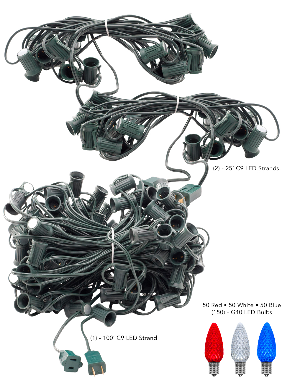 With 150 feet of magnetic C9 socket strand and 150 faceted LED RED, WHITE & BLUE LED bulbs, this bundle is designed to cover your home, storefront, or full property with vibrant, patriotic color that shines bright day or night.